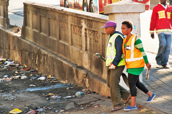 The woman in the picture below, Nomsa Mbatha, inspires us. Although almost completely blind (she navigates herself using a white cane), she is a member of the MES cleaning team and with assistance from her team mates, helps clean the streets of Hillbrow. Every morning before the team heads out to work, Nomsa leads the team in a song of praise. Like all the other participants of the MES programme, Nomsa was previously unemployed and homeless, but is now equipping herself with job-readiness skills.