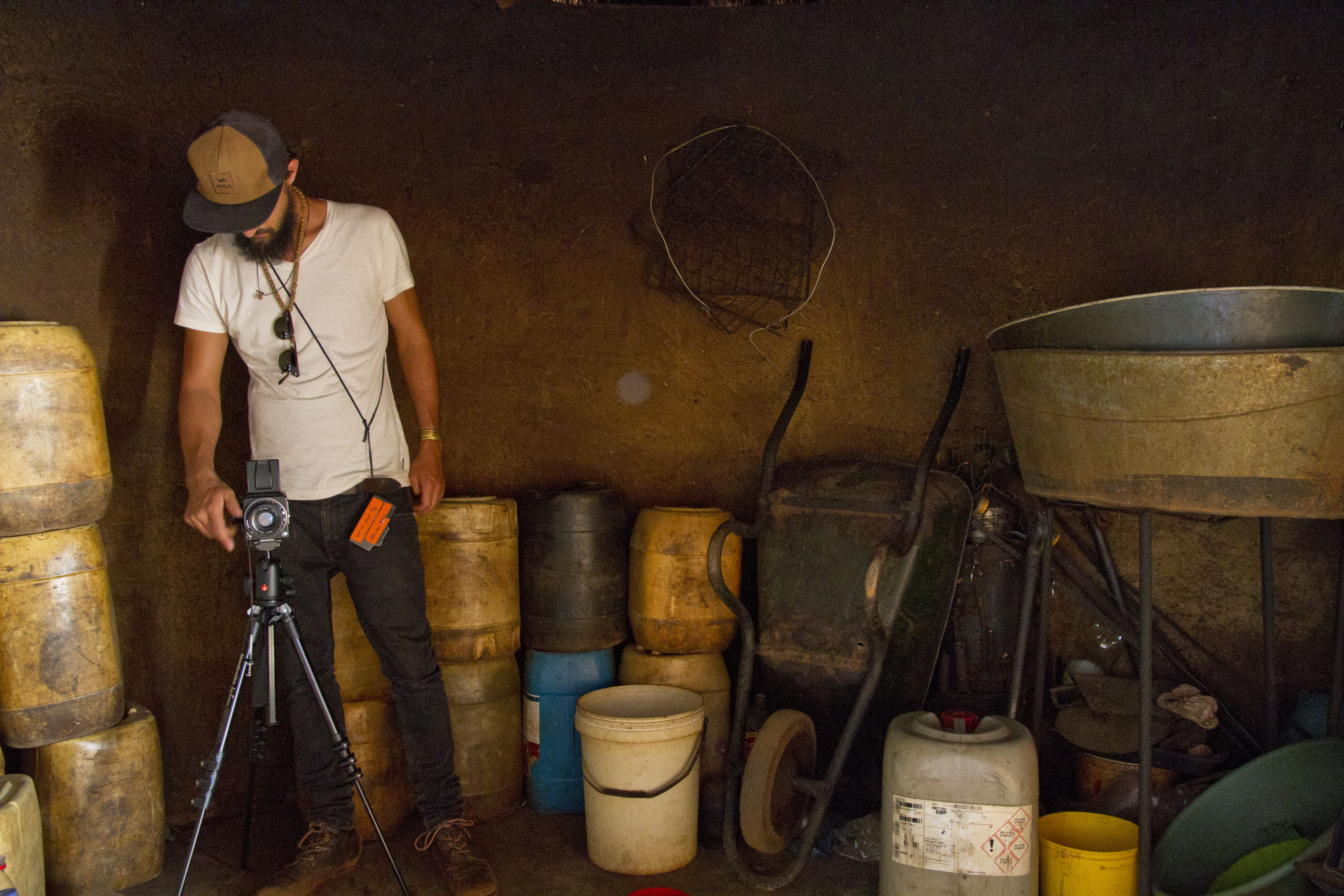 Above: Sometimes getting the best shot requires getting into some of the strangest places. Jono squeezes into the back of a storage room which gives him the best light for his shot.